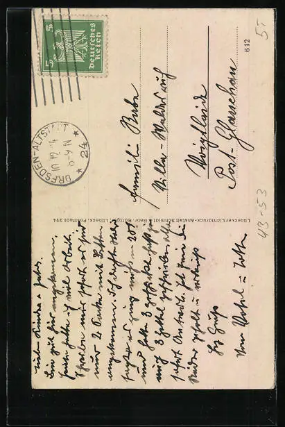 Personenbezogene Daten auf der Rückseite der Karte wurden durch blauen Textmarker unkenntlich gemacht. Die blauen Stellen sind auf die Vorderseite durchgeweicht und wirken sich negativ auf das Postkartenfoto aus