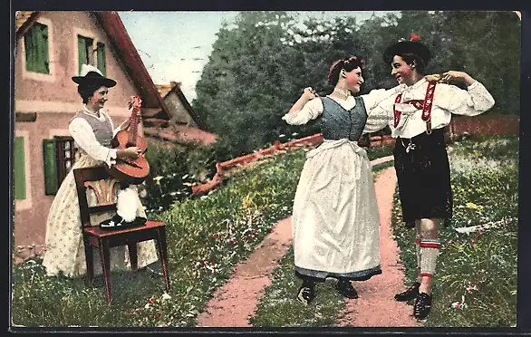 AK Paar in Tracht beim Volkstanz zu Gitarrenmusik