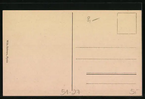 Personenbezogene Daten auf der Rückseite der Karte wurden durch blauen Textmarker unkenntlich gemacht. Die blauen Stellen sind auf die Vorderseite durchgeweicht und wirken sich negativ auf das Postkartenfoto aus