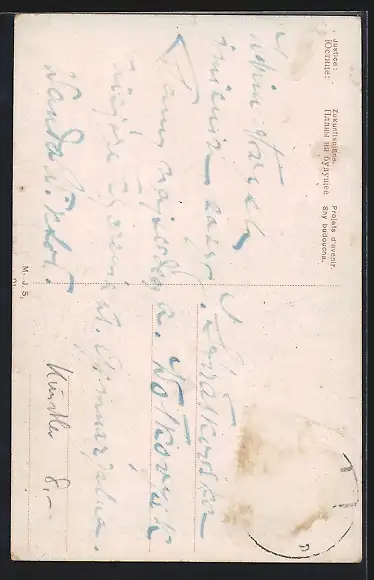 Personenbezogene Daten auf der Rückseite der Karte wurden durch blauen Textmarker unkenntlich gemacht. Die blauen Stellen sind auf die Vorderseite durchgeweicht und wirken sich negativ auf das Postkartenfoto aus