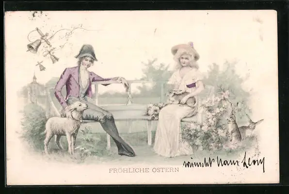 AK Paar mit Lamm und Osterhasen, Ostergruss