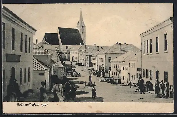 AK Pabneukirchen, Belebte Strassenpartie mit Blick zur Kirche