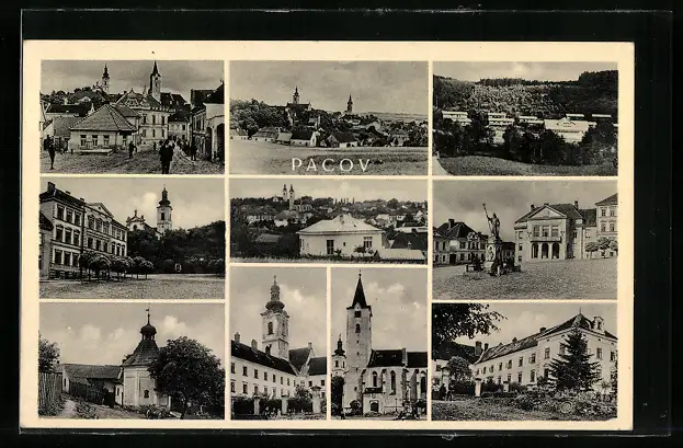 AK Pacov, Kirche, Denkmal, Ortspartie