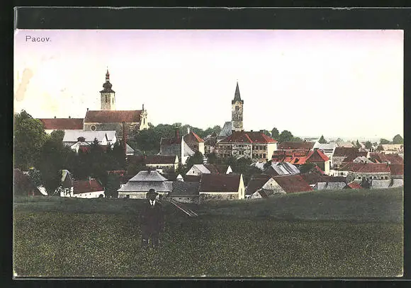 AK Pacov, Ortsansicht mit Kirche