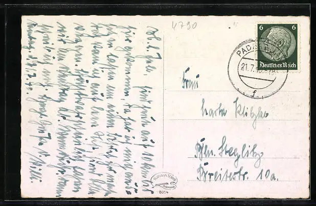 Personenbezogene Daten auf der Rückseite der Karte wurden durch blauen Textmarker unkenntlich gemacht. Die blauen Stellen sind auf die Vorderseite durchgeweicht und wirken sich negativ auf das Postkartenfoto aus
