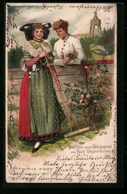 AK Pärchen im Garten in Tracht aus Umgegend von Bad Oeynhausen