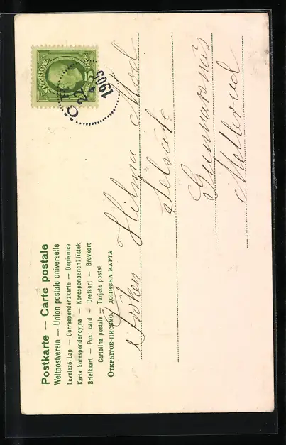 Personenbezogene Daten auf der Rückseite der Karte wurden durch blauen Textmarker unkenntlich gemacht. Die blauen Stellen sind auf die Vorderseite durchgeweicht und wirken sich negativ auf das Postkartenfoto aus