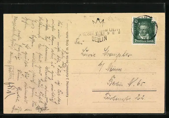 Personenbezogene Daten auf der Rückseite der Karte wurden durch blauen Textmarker unkenntlich gemacht. Die blauen Stellen sind auf die Vorderseite durchgeweicht und wirken sich negativ auf das Postkartenfoto aus