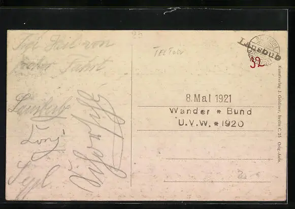 Personenbezogene Daten auf der Rückseite der Karte wurden durch blauen Textmarker unkenntlich gemacht. Die blauen Stellen sind auf die Vorderseite durchgeweicht und wirken sich negativ auf das Postkartenfoto aus
