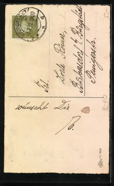 Personenbezogene Daten auf der Rückseite der Karte wurden durch blauen Textmarker unkenntlich gemacht. Die blauen Stellen sind auf die Vorderseite durchgeweicht und wirken sich negativ auf das Postkartenfoto aus