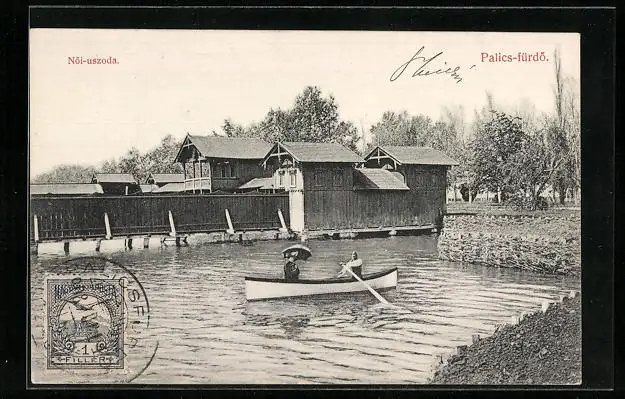 AK Palics-fürdö, Noi-uszoda, Teich mit Ruderboot