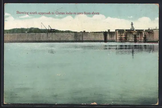 AK Panama Canal, Showing South approach to Gatun locks as seen from shore