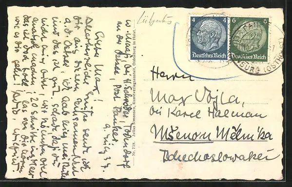 gelaufen 1937, Eckknicke re. unten u. li., guter Zustand