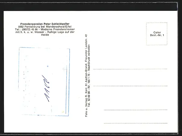 Personenbezogene Daten auf der Rückseite der Karte wurden durch blauen Textmarker unkenntlich gemacht. Die blauen Stellen sind auf die Vorderseite durchgeweicht und wirken sich negativ auf das Postkartenfoto aus