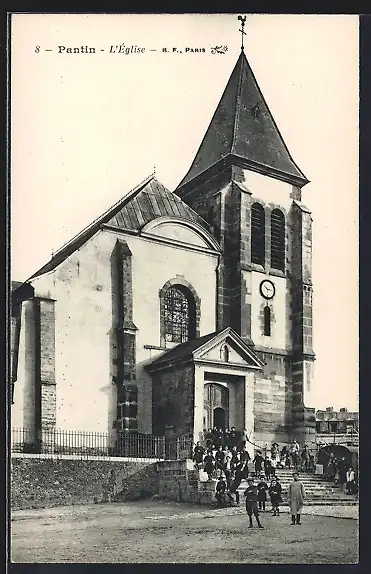 AK Pantin, L`Église avec groupe de personnes devant l`entrée