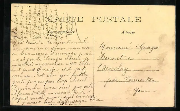 Personenbezogene Daten auf der Rückseite der Karte wurden durch blauen Textmarker unkenntlich gemacht. Die blauen Stellen sind auf die Vorderseite durchgeweicht und wirken sich negativ auf das Postkartenfoto aus