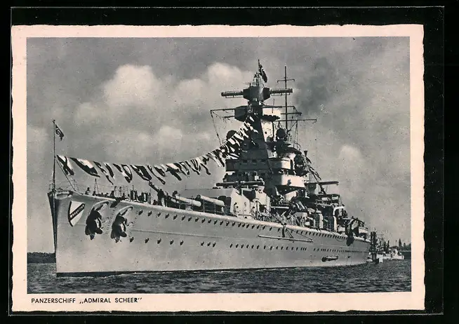 AK Panzerschiff Admiral Scheer der Kriegsmarine in Flaggengala, Bugansicht