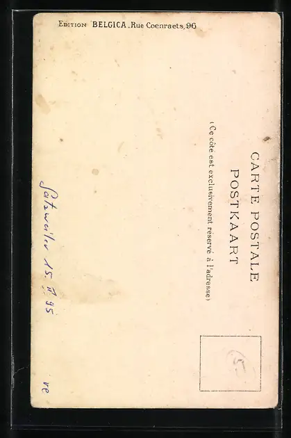 Personenbezogene Daten auf der Rückseite der Karte wurden durch blauen Textmarker unkenntlich gemacht. Die blauen Stellen sind auf die Vorderseite durchgeweicht und wirken sich negativ auf das Postkartenfoto aus