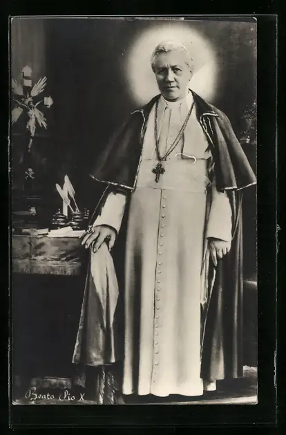 AK Papst Pius X. mit Heiligenschein und Kruzifix