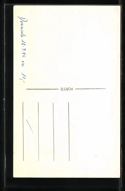 Personenbezogene Daten auf der Rückseite der Karte wurden durch blauen Textmarker unkenntlich gemacht. Die blauen Stellen sind auf die Vorderseite durchgeweicht und wirken sich negativ auf das Postkartenfoto aus