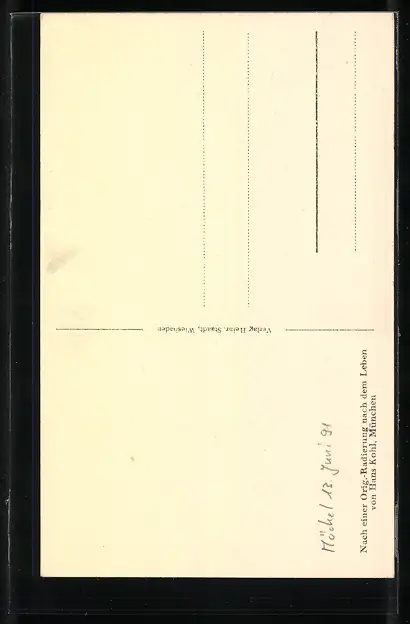 Personenbezogene Daten auf der Rückseite der Karte wurden durch blauen Textmarker unkenntlich gemacht. Die blauen Stellen sind auf die Vorderseite durchgeweicht und wirken sich negativ auf das Postkartenfoto aus