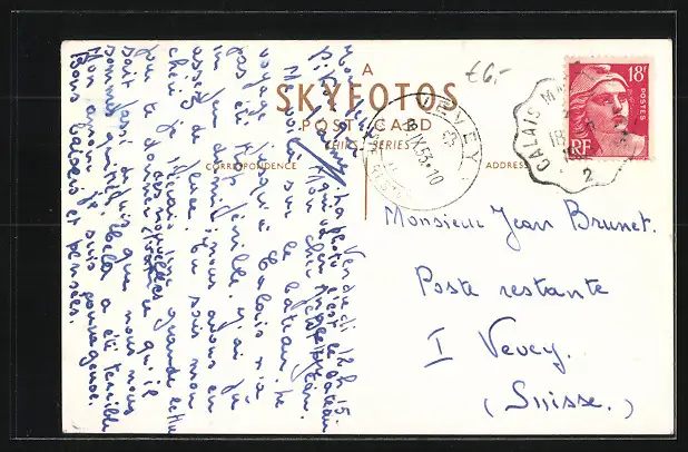 Personenbezogene Daten auf der Rückseite der Karte wurden durch blauen Textmarker unkenntlich gemacht. Die blauen Stellen sind auf die Vorderseite durchgeweicht und wirken sich negativ auf das Postkartenfoto aus