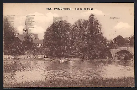 AK Parcé, Vue sur la Plage et le pont avec l`église en arrière-plan