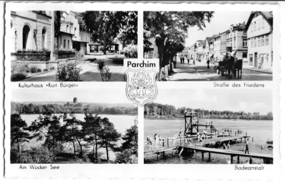 Ansichtskarte Parchim vier Abb. - Kulturhaus "Kurt Bürger", Str. d. Friedens, Am Wocker See, Badeanstalt Erhaltung I-II postalisch gelaufen, gestempelt: 4.9.57 Druckvermerk: 1957 Herstellungsland: DDR Verlag: VEB Volkskunstverlag Reichenbach i. V. - 2/418