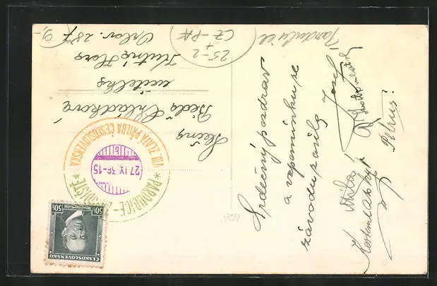 Personenbezogene Daten auf der Rückseite der Karte wurden durch blauen Textmarker unkenntlich gemacht. Die blauen Stellen sind auf die Vorderseite durchgeweicht und wirken sich negativ auf das Postkartenfoto aus