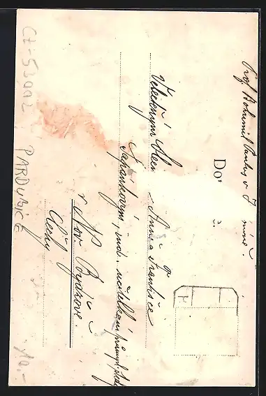 Personenbezogene Daten auf der Rückseite der Karte wurden durch blauen Textmarker unkenntlich gemacht. Die blauen Stellen sind auf die Vorderseite durchgeweicht und wirken sich negativ auf das Postkartenfoto aus