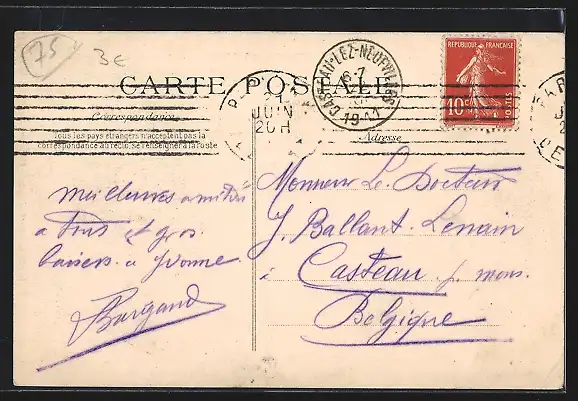 Personenbezogene Daten auf der Rückseite der Karte wurden durch blauen Textmarker unkenntlich gemacht. Die blauen Stellen sind auf die Vorderseite durchgeweicht und wirken sich negativ auf das Postkartenfoto aus