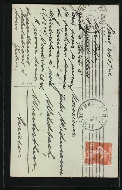 Personenbezogene Daten auf der Rückseite der Karte wurden durch blauen Textmarker unkenntlich gemacht. Die blauen Stellen sind auf die Vorderseite durchgeweicht und wirken sich negativ auf das Postkartenfoto aus