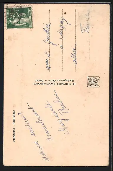 Personenbezogene Daten auf der Rückseite der Karte wurden durch blauen Textmarker unkenntlich gemacht. Die blauen Stellen sind auf die Vorderseite durchgeweicht und wirken sich negativ auf das Postkartenfoto aus