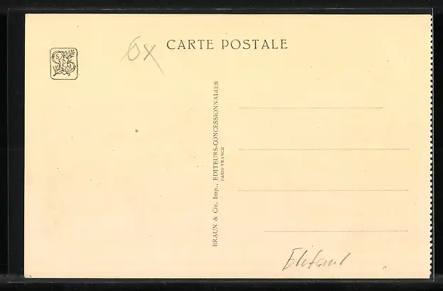 Personenbezogene Daten auf der Rückseite der Karte wurden durch blauen Textmarker unkenntlich gemacht. Die blauen Stellen sind auf die Vorderseite durchgeweicht und wirken sich negativ auf das Postkartenfoto aus