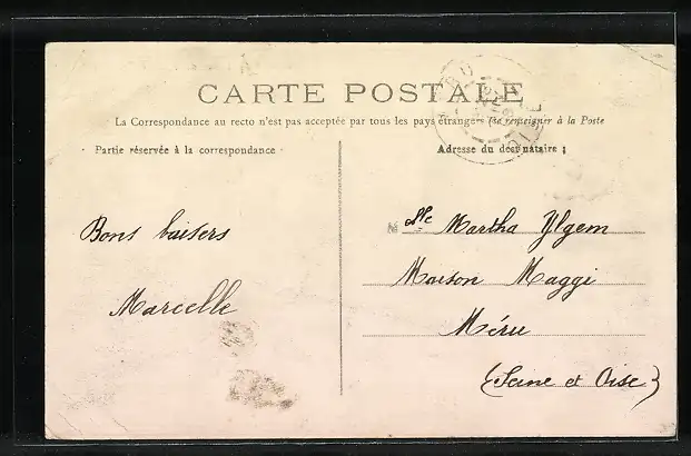 Personenbezogene Daten auf der Rückseite der Karte wurden durch blauen Textmarker unkenntlich gemacht. Die blauen Stellen sind auf die Vorderseite durchgeweicht und wirken sich negativ auf das Postkartenfoto aus