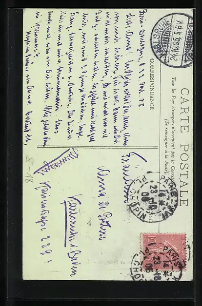 Personenbezogene Daten auf der Rückseite der Karte wurden durch blauen Textmarker unkenntlich gemacht. Die blauen Stellen sind auf die Vorderseite durchgeweicht und wirken sich negativ auf das Postkartenfoto aus