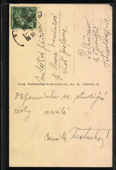 Personenbezogene Daten auf der Rückseite der Karte wurden durch blauen Textmarker unkenntlich gemacht. Die blauen Stellen sind auf die Vorderseite durchgeweicht und wirken sich negativ auf das Postkartenfoto aus