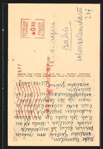 Personenbezogene Daten auf der Rückseite der Karte wurden durch blauen Textmarker unkenntlich gemacht. Die blauen Stellen sind auf die Vorderseite durchgeweicht und wirken sich negativ auf das Postkartenfoto aus
