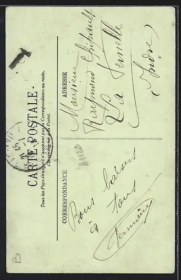 Personenbezogene Daten auf der Rückseite der Karte wurden durch blauen Textmarker unkenntlich gemacht. Die blauen Stellen sind auf die Vorderseite durchgeweicht und wirken sich negativ auf das Postkartenfoto aus