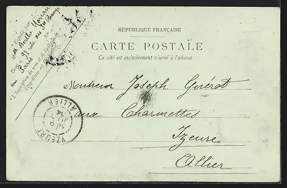 Personenbezogene Daten auf der Rückseite der Karte wurden durch blauen Textmarker unkenntlich gemacht. Die blauen Stellen sind auf die Vorderseite durchgeweicht und wirken sich negativ auf das Postkartenfoto aus