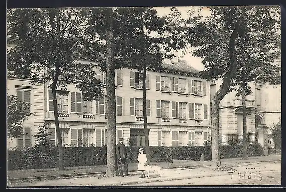 AK Paris, Promenade devant une école avec un homme, une fille et un chien