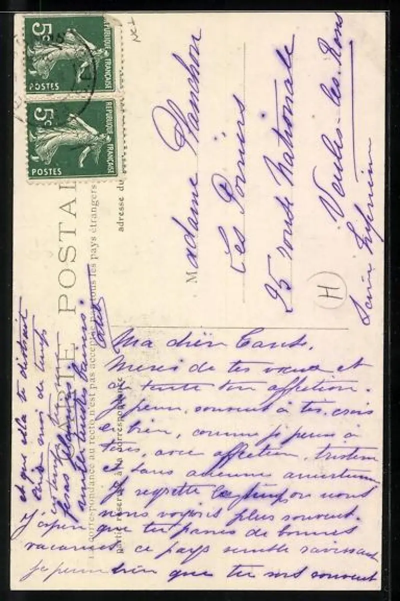 Personenbezogene Daten auf der Rückseite der Karte wurden durch blauen Textmarker unkenntlich gemacht. Die blauen Stellen sind auf die Vorderseite durchgeweicht und wirken sich negativ auf das Postkartenfoto aus