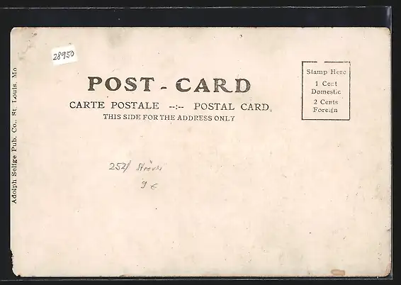 Personenbezogene Daten auf der Rückseite der Karte wurden durch blauen Textmarker unkenntlich gemacht. Die blauen Stellen sind auf die Vorderseite durchgeweicht und wirken sich negativ auf das Postkartenfoto aus