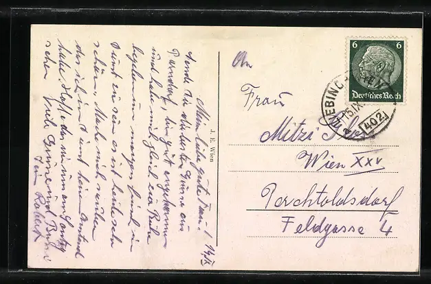 Personenbezogene Daten auf der Rückseite der Karte wurden durch blauen Textmarker unkenntlich gemacht. Die blauen Stellen sind auf die Vorderseite durchgeweicht und wirken sich negativ auf das Postkartenfoto aus
