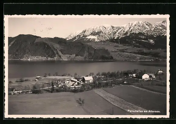 AK Parschhallen /Attersee, Panorama mit Gebirge