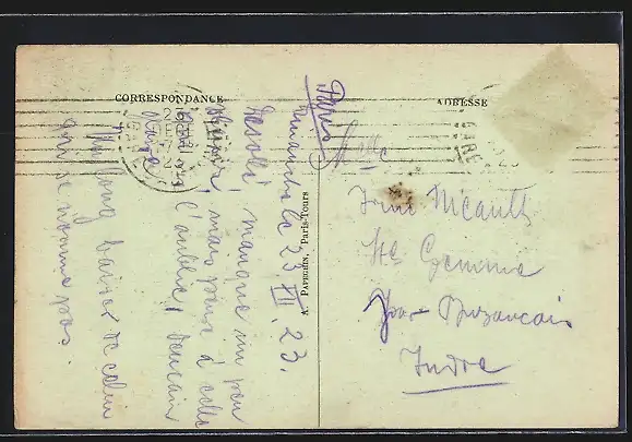 Personenbezogene Daten auf der Rückseite der Karte wurden durch blauen Textmarker unkenntlich gemacht. Die blauen Stellen sind auf die Vorderseite durchgeweicht und wirken sich negativ auf das Postkartenfoto aus