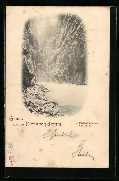 Personenbezogene Daten auf der Rückseite der Karte wurden durch blauen Textmarker unkenntlich gemacht. Die blauen Stellen sind auf die Vorderseite durchgeweicht und wirken sich negativ auf das Postkartenfoto aus