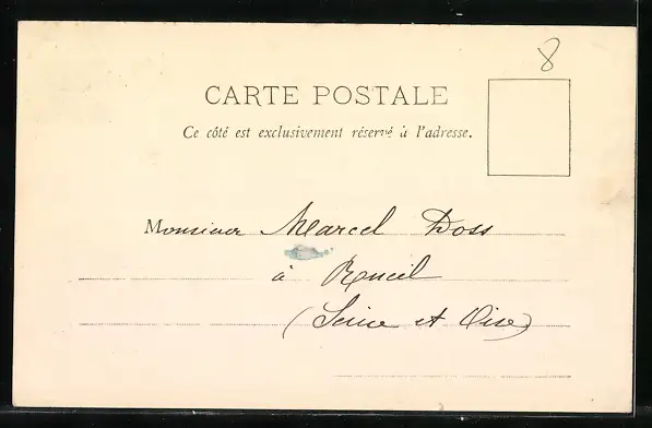 Personenbezogene Daten auf der Rückseite der Karte wurden durch blauen Textmarker unkenntlich gemacht. Die blauen Stellen sind auf die Vorderseite durchgeweicht und wirken sich negativ auf das Postkartenfoto aus