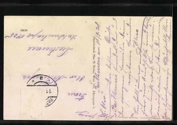 Personenbezogene Daten auf der Rückseite der Karte wurden durch blauen Textmarker unkenntlich gemacht. Die blauen Stellen sind auf die Vorderseite durchgeweicht und wirken sich negativ auf das Postkartenfoto aus