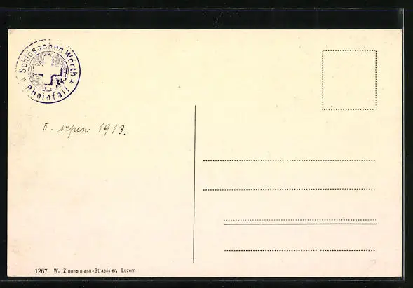 Personenbezogene Daten auf der Rückseite der Karte wurden durch blauen Textmarker unkenntlich gemacht. Die blauen Stellen sind auf die Vorderseite durchgeweicht und wirken sich negativ auf das Postkartenfoto aus